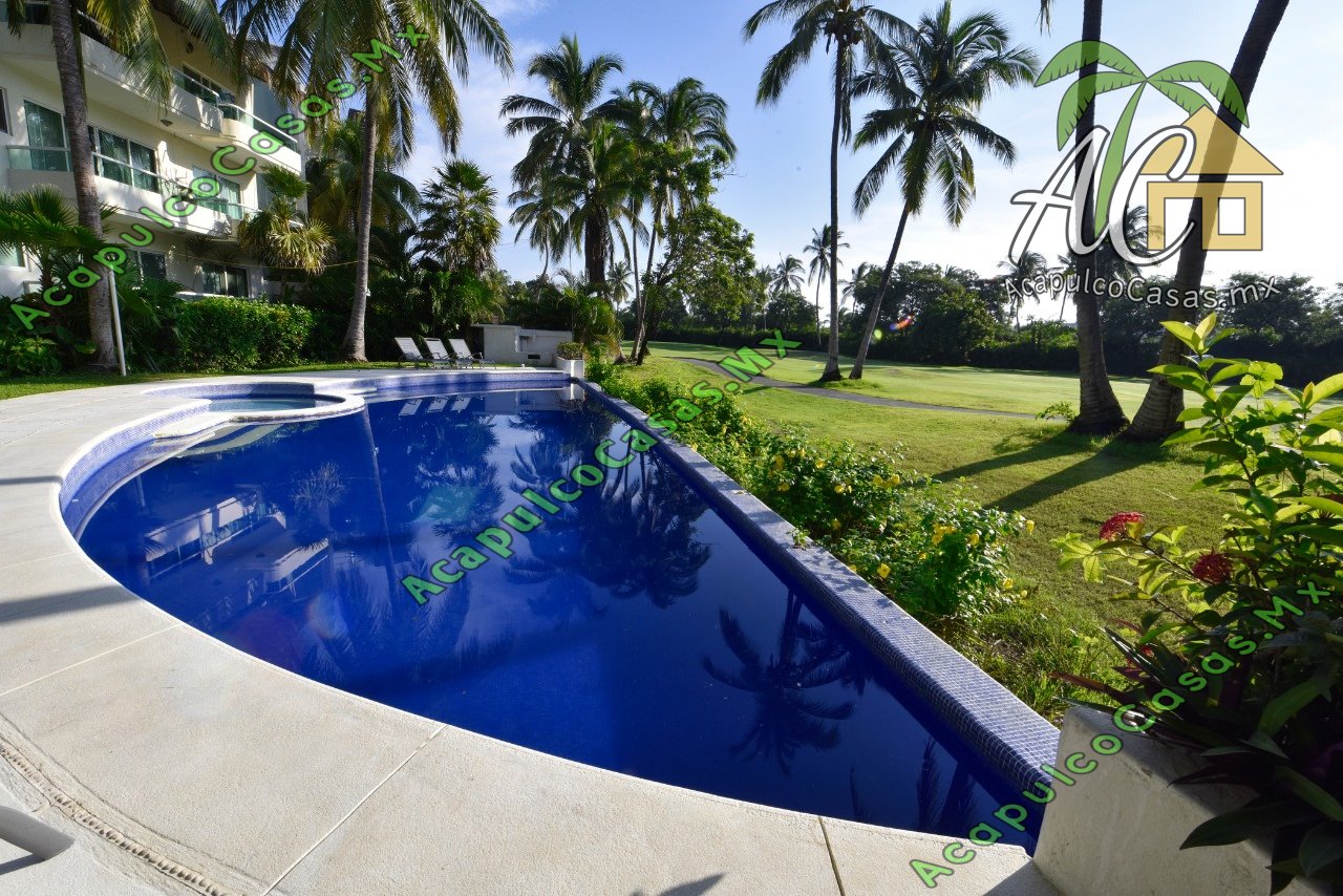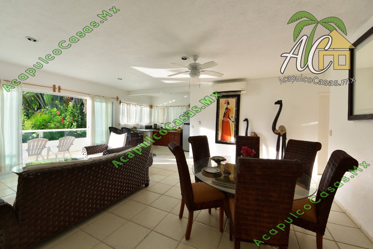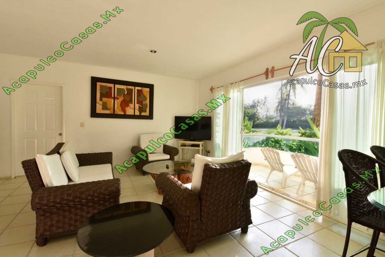 Sala, cocina equipada, TV, comedor. alberca común con camastros.