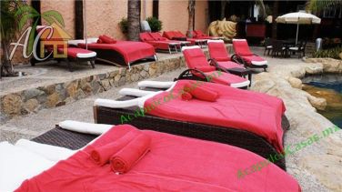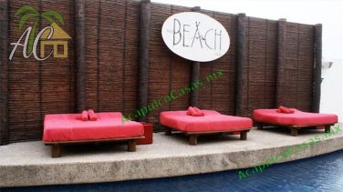 alimentos y áreas para asolearse, con camastros y sombrillas.